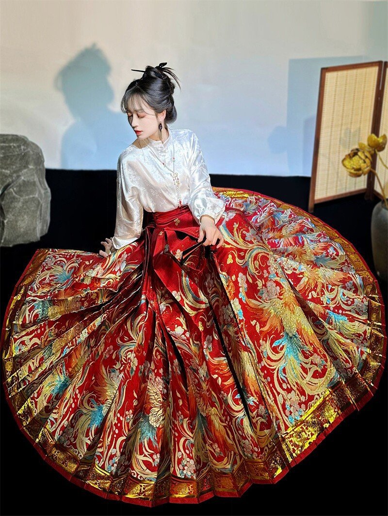 Women’s clothing in the middle Ming Dynasty showed greater creativity. The aoqun remained the mainstream, but with more varied designs: the jacket (ao) became shorter, and the skirt (qun) became longer, forming a “high-waisted” effect by tying the skirt waist above the chest. The mamianqun (horse-face skirt), a iconic Ming women’s skirt, was finalized during this period – it featured two overlapping pleats in the front and back, resembling a horse’s face, with decorative borders (jiaoxian) on the sides, combining practicality and aesthetics. Noble women also favored the beizi (a loose overcoat with wide sleeves), which was made of light gauze or brocade and worn over the aoqun, creating a graceful silhouette.
