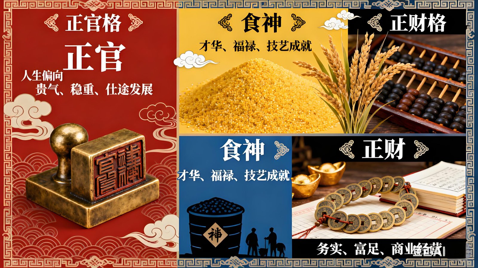 Figure 3: A comparative chart of major Ba Zi patterns, including their core stars, symbolic representations, and corresponding life tendencies. For example, the Direct Officer Pattern is symbolized by a government official’s seal, while the Food God Pattern is represented by a grain harvest—illustrating how patterns draw on traditional Chinese social and agricultural imagery .