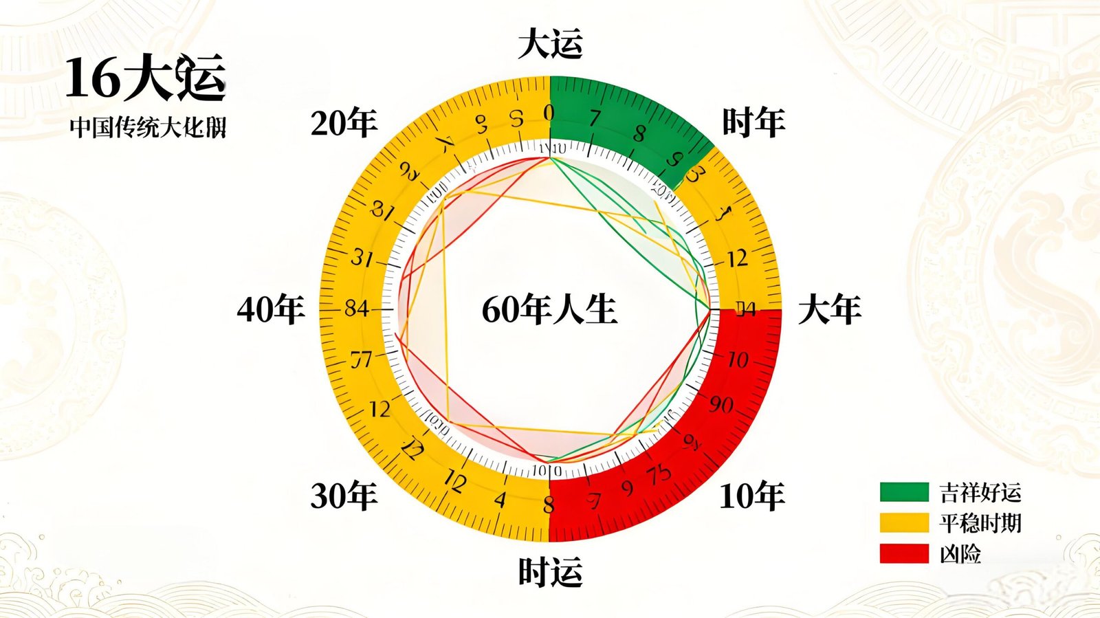 Figure 5: A visual timeline showing a 60-year life span divided into six Great Cycles (10 years each), with key Annual Cycles highlighted. The diagram illustrates how cycle elements interact with the birth chart’s core elements, using color-coding to indicate favorable (green), neutral (yellow), and unfavorable (red) periods—reflecting the Chinese belief in the cyclical nature of destiny .
