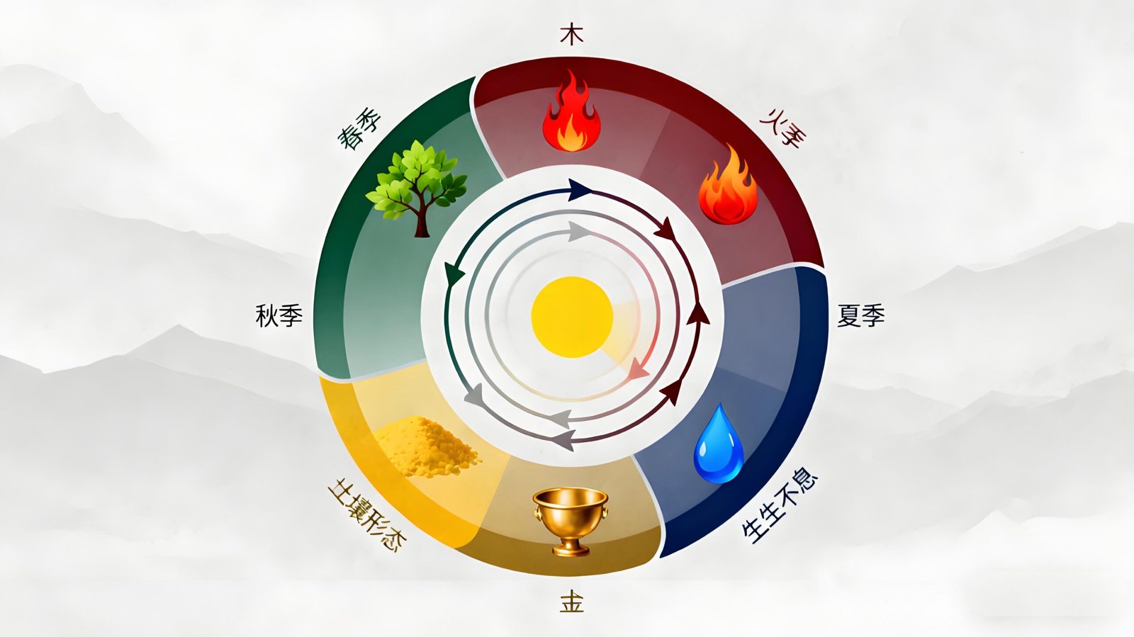 Figure 2: A circular diagram illustrating how each Five Element (Wood, Fire, Earth, Metal, Water) gains or loses strength across seasons. The arrows indicate the dynamic flow of energy, embodying the Taoist principle of “constant transformation” and the Chinese understanding of nature’s cycles .