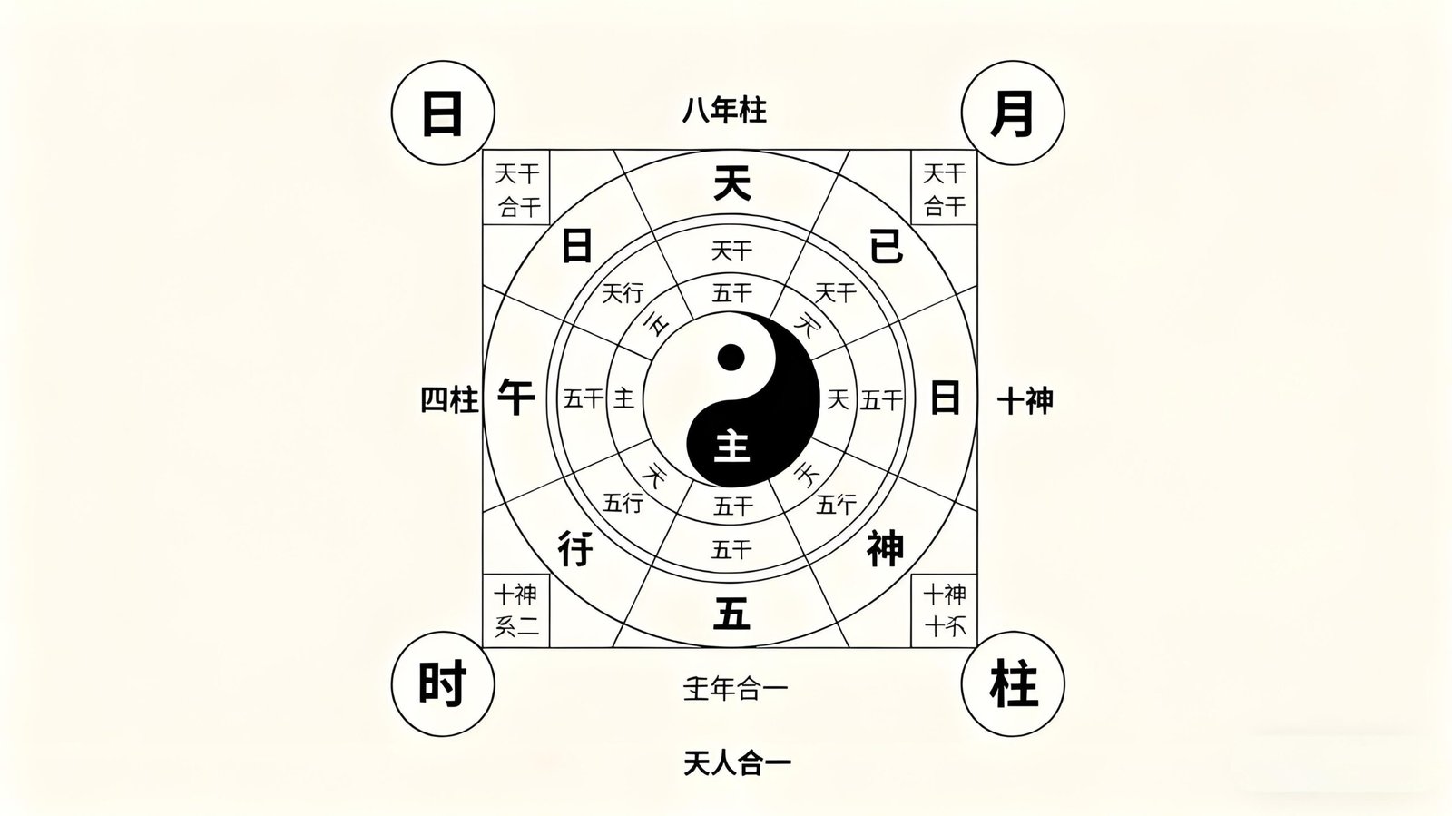 Figure 1: A visual representation of a Four Pillars chart, showing the Year, Month, Day, and Hour Pillars (each with one Heavenly Stem and one Earthly Branch). The Day Master (center) represents the individual, surrounded by elements illustrating Five Elements interactions and Ten Gods relationships—epitomizing the “microcosm reflecting the macrocosm” concept in Taoist philosophy .