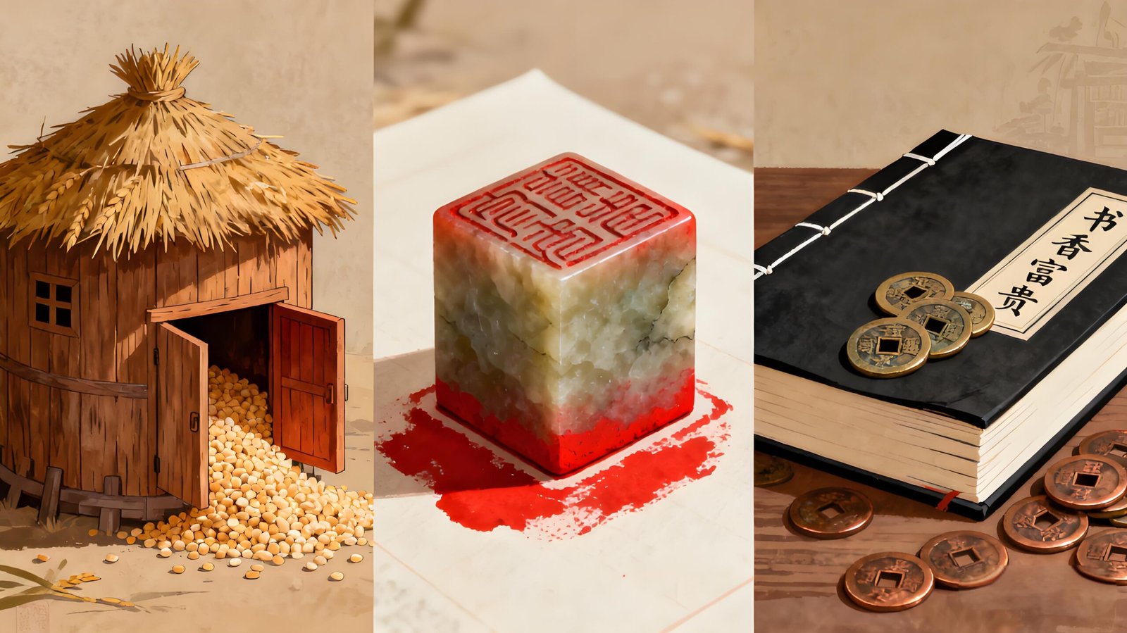Figure 6: A symbolic representation of key Wealth and Rank patterns. The Direct Wealth Pattern is illustrated with a grain store (symbolizing stable prosperity), the Direct Officer Pattern with an official’s seal (representing authority), and the Resource-Wealth Pattern with a book and coins (embodying the traditional Chinese ideal of “scholarly prosperity”) .