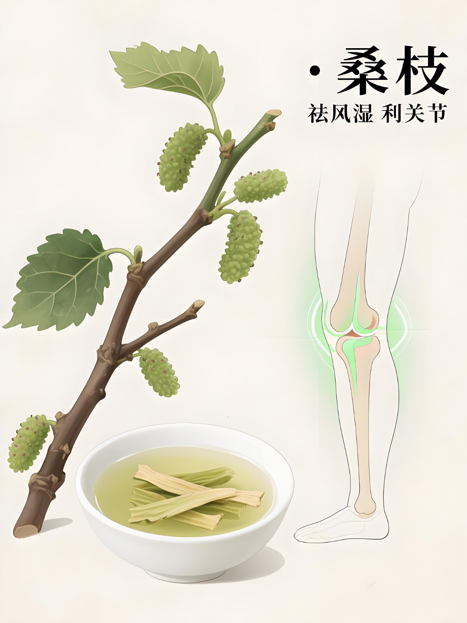 Ramulus Mori, bitter and neutral, enters the Liver Meridian. It treats rheumatic arthralgia, dispels wind-damp from muscles, bones and joints, relaxes spasm and unblocks meridians, and relieves upper limb soreness and numbness, suitable for both wind-cold and heat arthralgia with compatibility.