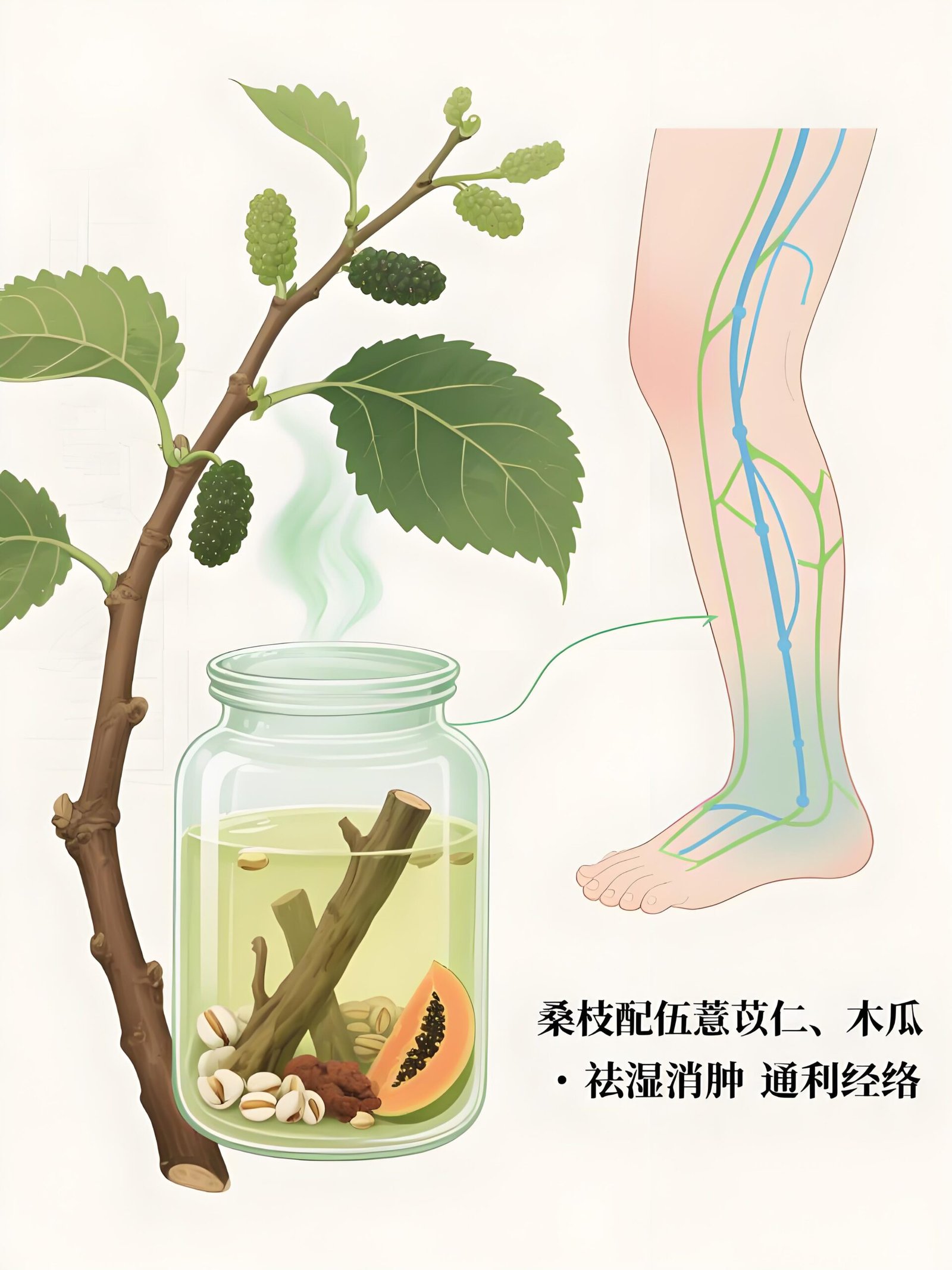 Ramulus Mori unblocks meridians to promote water-damp metabolism, auxiliary regulates edema from rheumatic arthralgia and lower limb swelling/numbness from beriberi. Its water-draining power is mild, and combining with Semen Coicis enhances damp-dispelling and swelling-reducing effects.