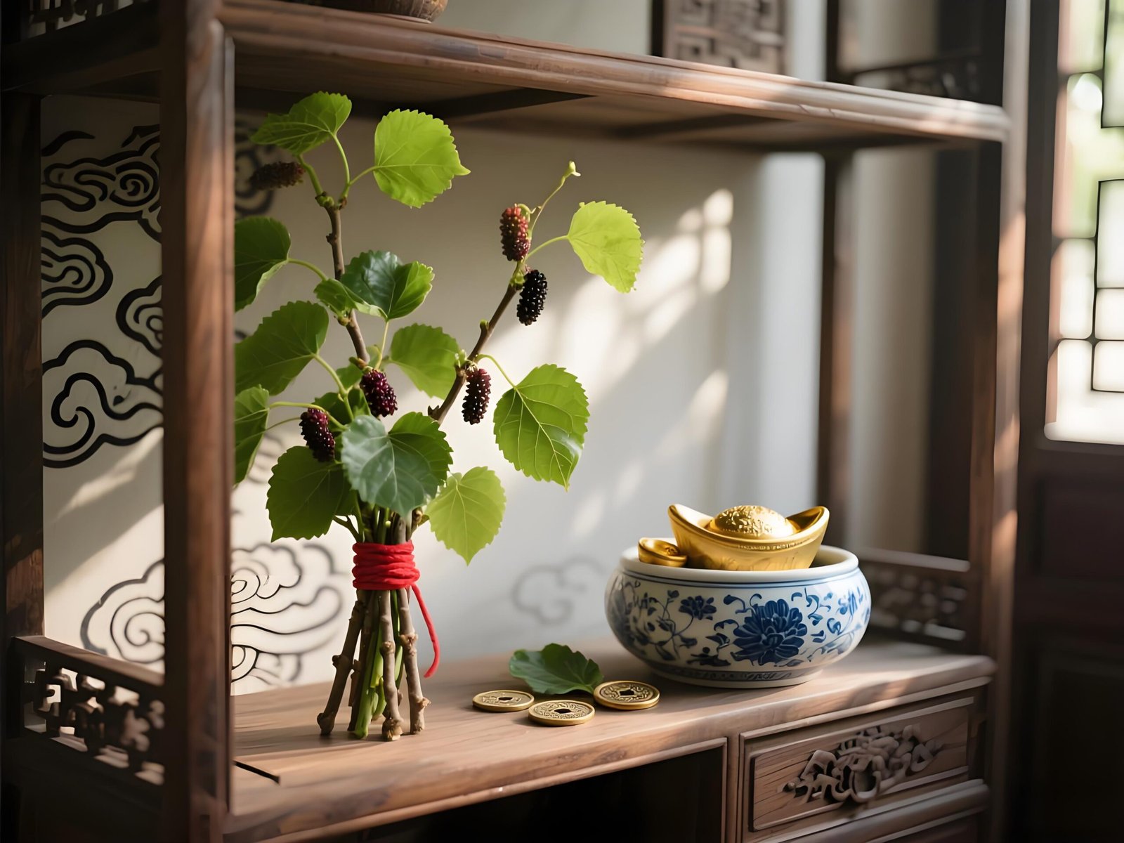In feng shui, mulberry trees are yin wood, which can protect the house from evil spirits and safeguard the family’s safety. Since mulberry leaves are beneficial for silkworm rearing and silk production, there is a folk saying “planting mulberries in front of the door makes one the richest in the area”, implying the feng shui meaning of attracting wealth.
