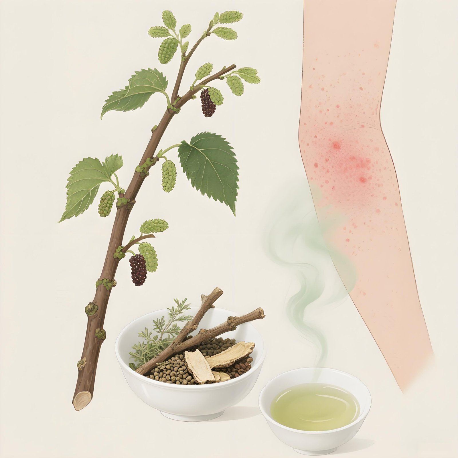 Ramulus Mori dispels wind and clears skin damp-turbidity, treating skin pruritus caused by wind mixed with dampness. Taken internally to regulate qi movement and externally to act on skin, it is often combined with Fructus Kochiae to relieve eczema and dry pruritus.