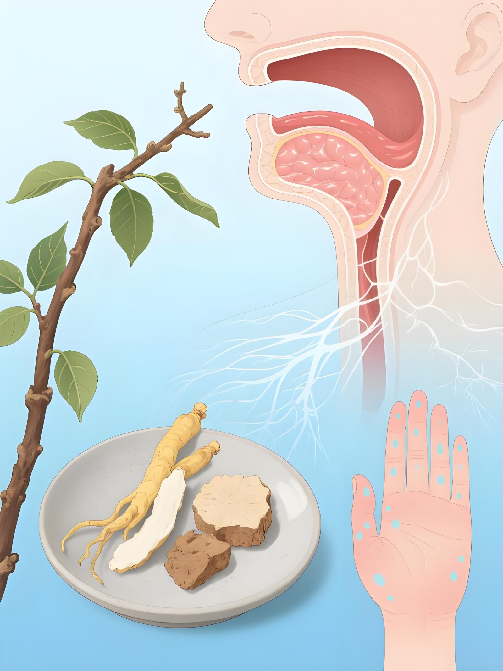 Modern TCM finds Ramulus Mori regulates body fluids with specific compatibility, auxiliary improves thirst/dry throat in diabetes with limb numbness. Combined with yin-nourishing herbs like Rhizoma Anemarrhenae, it unblocks meridians to promote fluid distribution.