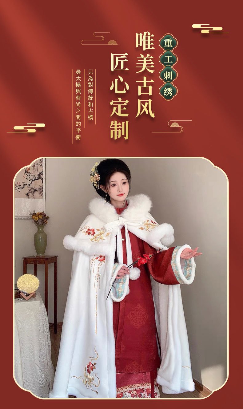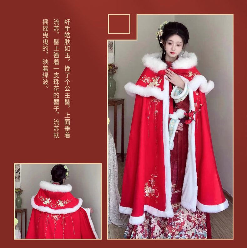 1. The long cape version restores ancient style, with fleece-lined thickening and large fur collar enhancing warmth. It combines the elegance of Hanfu and winter practicality, thick but not clumsy, suitable for ancient-style outfits and solving the warmth problem of Chinese-style winter looks.