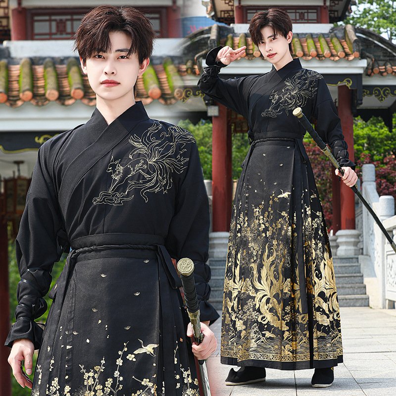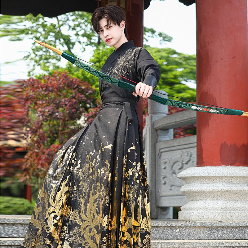 1. Designed specifically for men, it is based on Hanfu’s version, pairing a cross-collar long-sleeve top with a horse-face skirt. It reduces the complexity of traditional Hanfu, integrates the neat and valiant vibe of martial arts style, breaks the inherent impression of horse-face skirts, and combines the simplicity of neo-Chinese style with the classicism of Hanfu, suitable for those pursuing Chinese-style martial arts-inspired outfits.